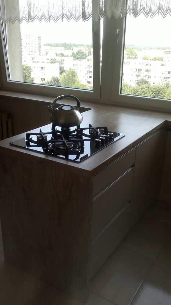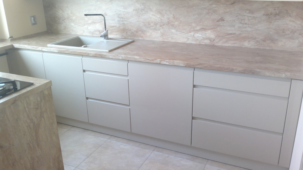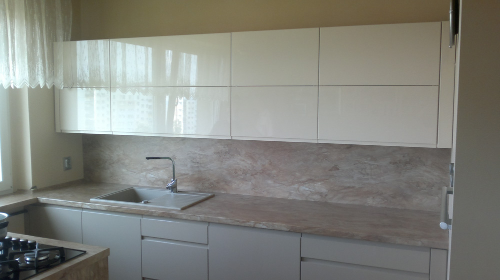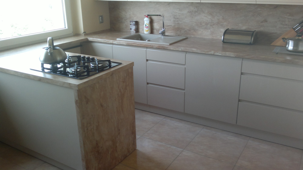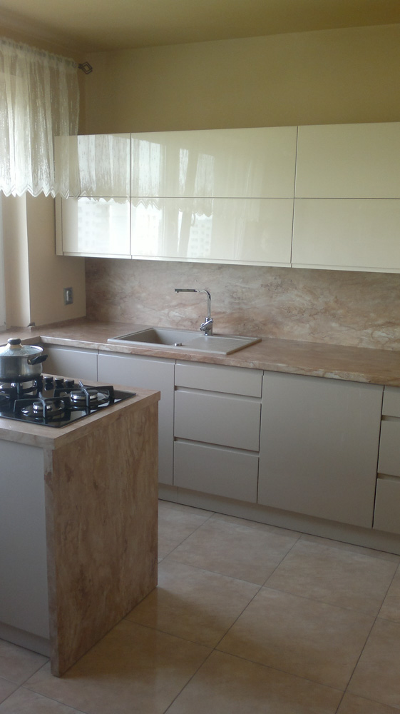 Do mebli kuchennych stosujemy blaty postformingowe o grubości 28 i 38 mm w ponad 200 kolorach i wzorach oraz blaty wykonane z marmurów, granitów i konglomeratów.